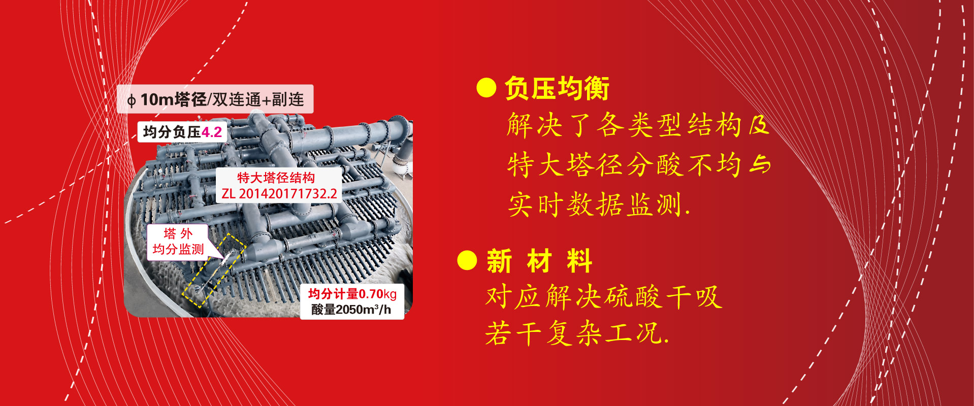 優質服務負壓與結構對酸流的均衡與穩流、流量和布點均分、遠程均分監測、新材料研發應用、負壓節電、區域調流